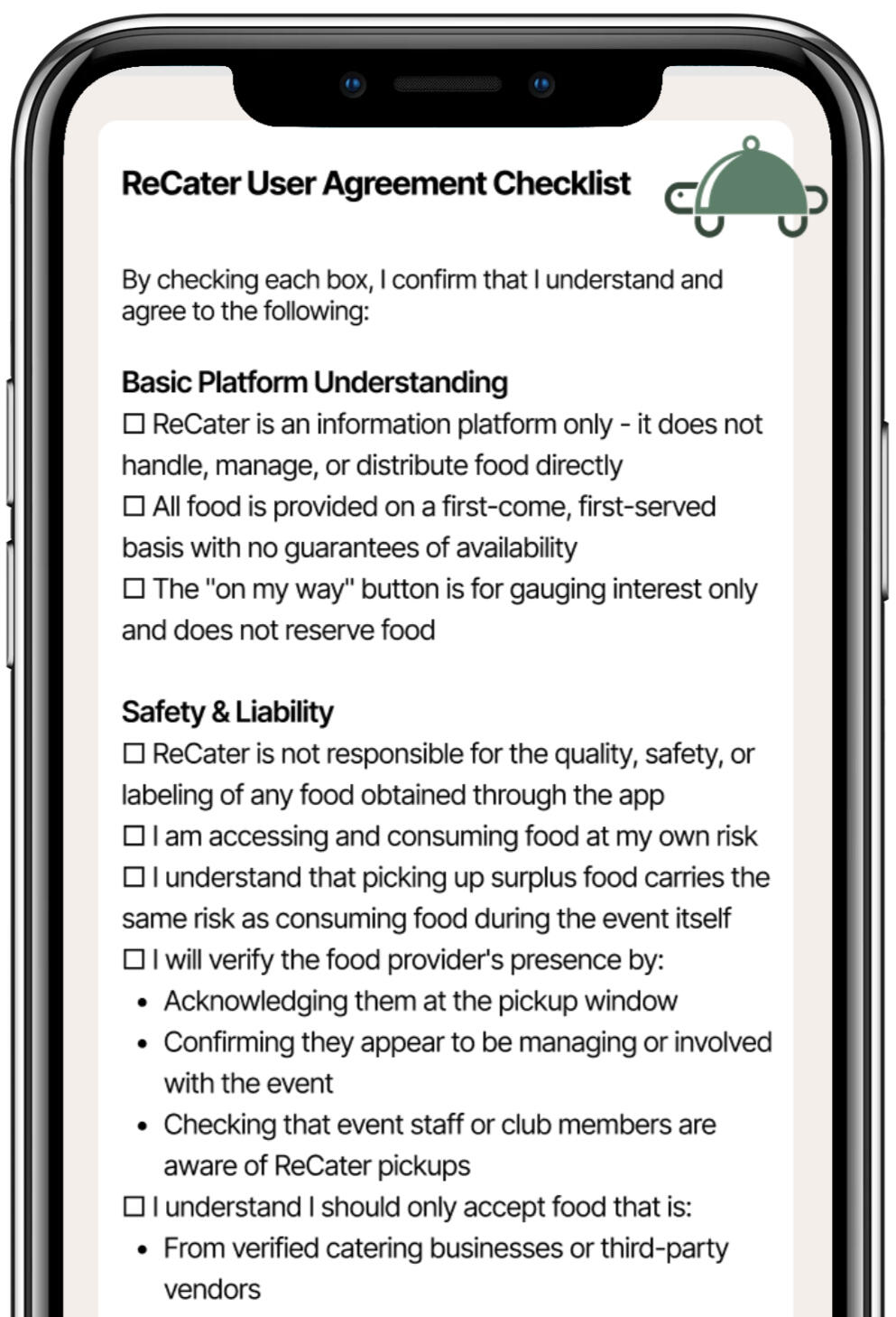 ReCater includes built-in resources and guidelines for worry-free food redistribution.